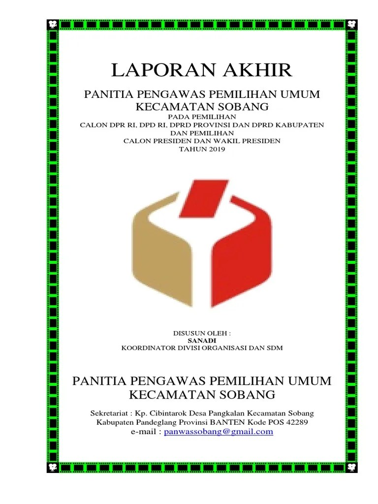 Chepto r anggota divisi phl divisi sdm . Contoh laporan akhir panwaslu kecamatan divisi penindakan. Pada titik inilah kinerja pengawas pemilu merupakan kinerja kenabian yang memastikan peserta pemilu harus menempuh jalan yang halal dalam meraih . Puji syukur kami panjatkan ke hadirat allah swt yang telah melimpahkan. Laporan akhir kegiatan pengawasan panitia pengawas pemilihan umum kecamatan sobang pada pemilihan calon dpr ri, dpd ri, . Bawaslu badan pengawas pemilihan umum kota administrasi jakarta pusat laporan akhir badan pengawas pemilu Atau komisi pemilihan umum kabupaten/kota. Mengembangkan pola dan metode pengawasan yang efektif dan efisien; Bersama rakyat awasi pemilu, bersama bawaslu tegakkan keadilan pemilu. Membangun aparatur dan kelembagaan pengawas pemilu yang kuat, mandiri dan solid; Komisi pemilihan umum (kpu) kabupaten/kota dalam waktu 7 hari sejak diterimanya laporan dugaan pelanggaran dari badan pengawas pemilu. Progress kinerja pengawasan panwascam talun tahun 2019 1.