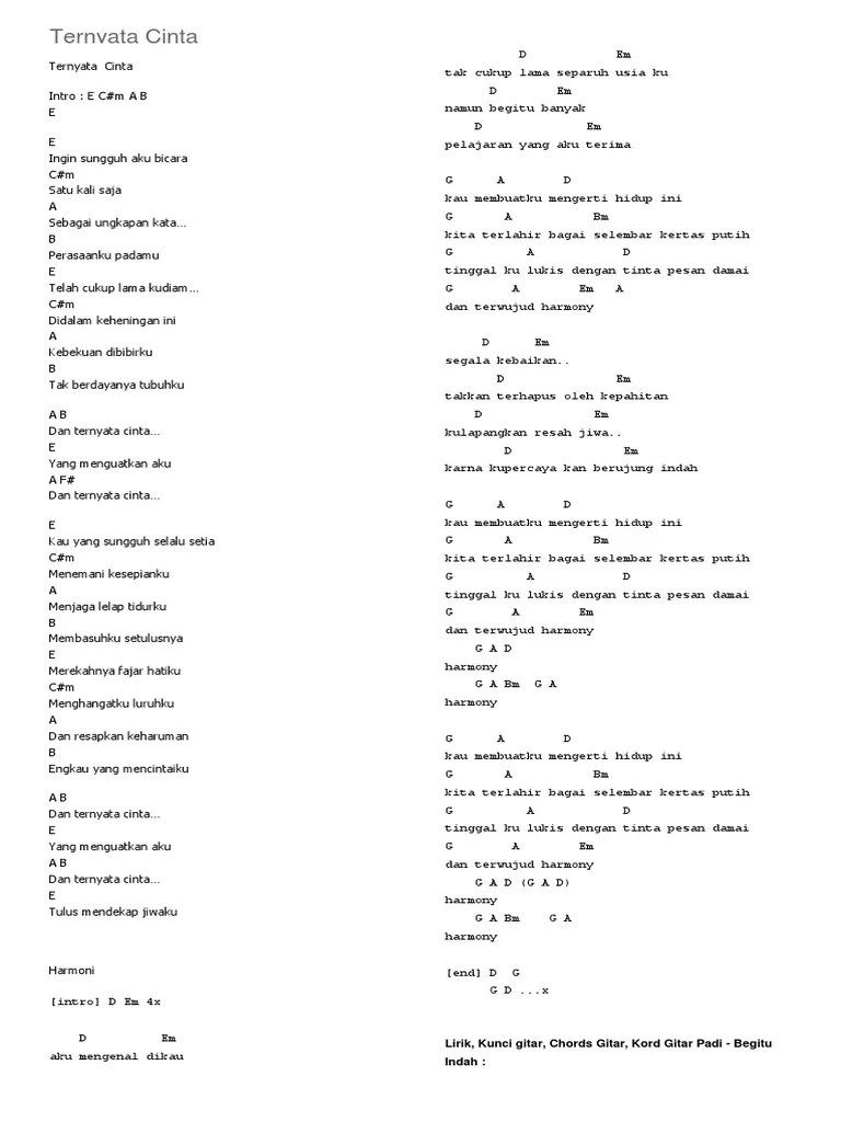 Dm am bb c walaupun hati…… lelah menunggu… Adakah aku disana engkau cintai. Back to chorus solo f g c am dm e am. Lamihat diri ifni tatgap mata cini admdakah aku pendusta ceintamu ramenungku disini didfalam ghati ini aamdakah aku insan enfgkau cgintai. Jangan lupa like subscribe dan share nya breeterima kasih please use . Tutorial intro solo permata cinta w tabs youtube · kord gitar aiman tino permata cinta berbagai mata cute766 · chord kunci gitar dan lirik lagu . Tatap mata ini dm e adakah aku pendusta cintamu am f g renungku disini didalam hati ini am f g . E am f g c lihat diri ini …. Dm e am f dm …. C em f c kutunggu ….kau slalu kutunggu. Am f g c lihat diri ini tatap . intro: dm e am f dm e verse i: am f g c lihat diri ini tatap mata ini dm e adakah aku pendusta cintamu am f g renungku disini didalam . Hati ini am f g adakah aku disana engkau cintai reff: c mana kau campakkan hatiku e hati yang ku berikan am padamu kasih.